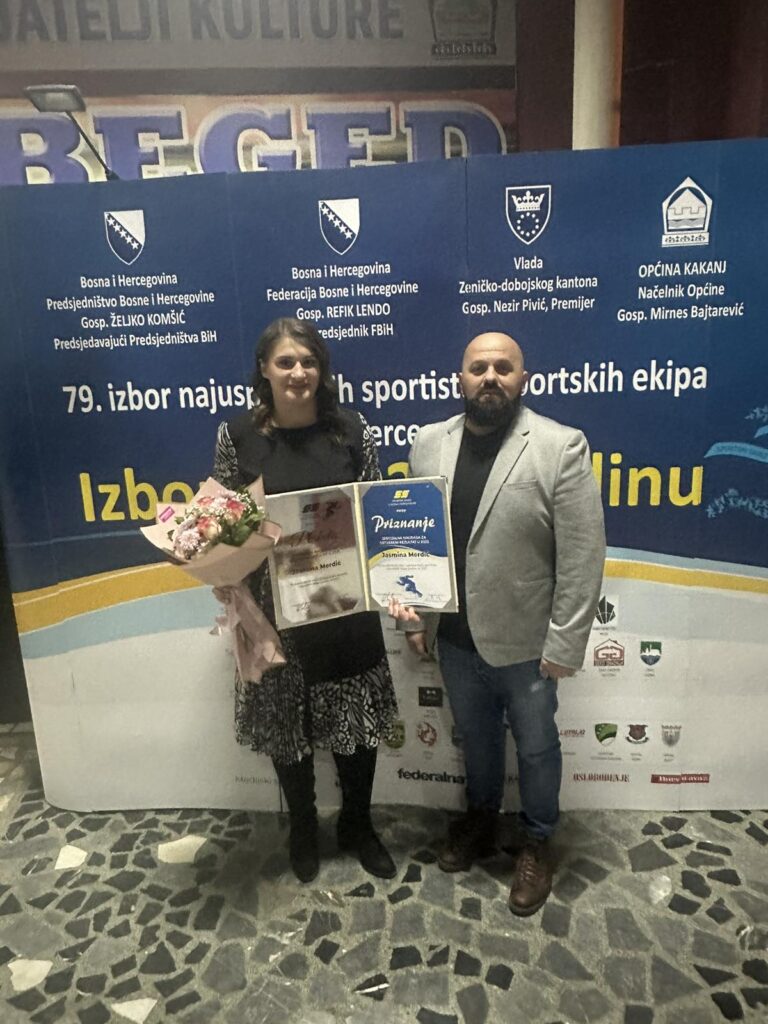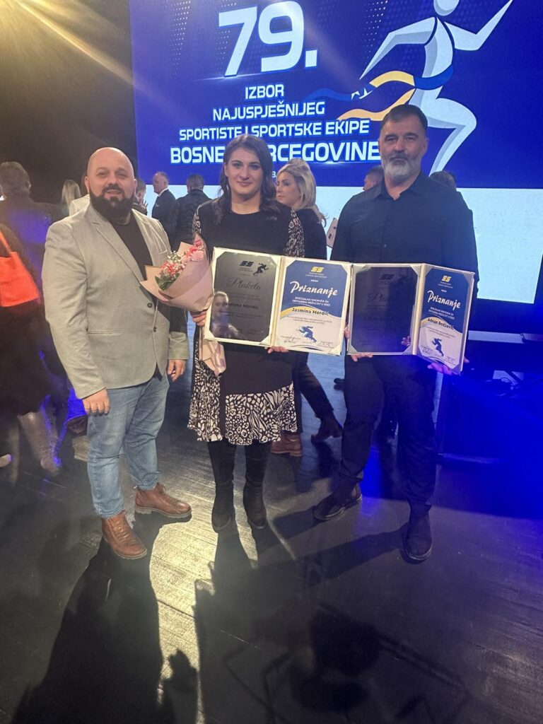 Večeras je u Kaknju, u dvorani ispunjenoj do posljednjeg mjesta, održan 79. Izbor sportiste Bosne i Hercegovine. Na ovoj manifestaciji nagrađeni su i članovi našeg kolektiva. Jasmina Merdic , vodeća na WAKO Svjetskoj rang listi, seniorska viceprvakinja Svijeta, osvajačica dva Svjetska kupa, dobila je prestižno priznanje za ostvarene vrhunske sportske rezultate u 2023. godini. U uži krug izbora najboljih trenera odnosno u top 3 trenera naše domovine izabran je i trener našeg kolektiva Elvedin Dubravac , kojemu je na ovaj način odano veliko priznanje za dugogodišnji rad i vrhunske sportske rezultate koje je postigao.